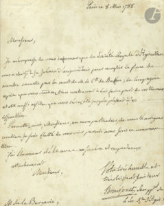que « la Société Royale d’Agriculture vous a choisi à sa séance d’aujourdhui pour remplir la place de membre vacante par la mort de M. le Cte de Buffon ; la Compagnie espère que vous voudrez bien continuer à lui faire part de vos travaux et etre aussi assidu que vous l’avez été jusqu’à présent à ses assemblées »...