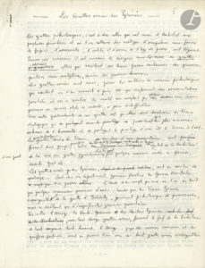 Norbert CASTERET (1897-1987) spéléologue. 5 manuscrits autographes, [vers 1940 ; 12 pages et demie in-4 (la plupart au dos de tapuscrits ou textes ronéotés). – Les Grottes ornées des Pyrénées, sur les grottes...