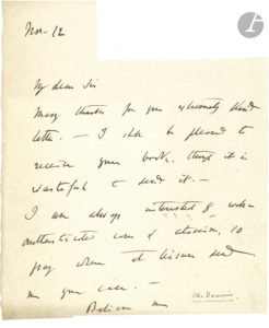 en anglais. Lettre qui semble inédite, relative à un cas d’atavisme (en biologie évolutive du développement : réapparition d’un caractère ancestral chez un individu). « My dear Sir Many thanks for your extremely kind letter. I shall be pleased to receive your book, though it is wasteful to send it. I am always interested by well-authenticated cases of atavism, so […] at leisure send me your case. Believe me ». On joint un portrait gravé d’Erasmus Darwin, grand-père de Charles.