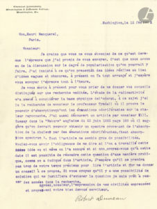 en-tête du Chemical Laboratory, Washington & Jefferson College ; 2 en anglais, la 2e en français. Il a reçu ses deux publications et évoque l’article qu’il prépare avec McClure et Phillips. – Il demande des conseils « sur une recherche méditée. L’étude de la radioactivité m’a amené à considérer la base physique de l’odorat » ; il a lu à ce sujet la recherche du professeur Tyndall « où il prouve le pouvoir d’absorption qu’ont les émanations odoriférantes sur la chaleur rayonnante », ainsi qu’un article de Will. Ramsay suggérant « qu’on devrait pouvoir obtenir un spectre provenant de l’absorption de la chaleur par des émanations odoriférantes (heat absorption spectrum) »... – Il sollicite le sentiment de Becquerel au sujet de son article sur la radioactivité, à paraître dans le Harper’s Magazine...
