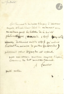 Joseph FOURIER (1768-1830) mathématicien. L.A.S., jeudi matin, à André Ampère ; 1 page in-8, adresse. Il lui réclame le bulletin de la Société philomathique de 1815 contenant l’extrait d’un mémoire sur les...
