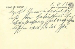 Sigmund FREUD (1856-1939). L.A., Wien 1er juin 1931 ; 1 page oblong in-12 sur carte à son en-tête Prof. Dr Freud Wien, IX., Berggasse 19 ; en allemand. Remerciements pour un souvenir. Freud « dankt Ihnen und freut sich daß...