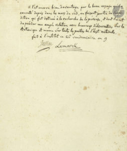 appréciation sur un navigateur. « Il l’est encore bien davantage par le beau voyage qu’il a exécuté depuis les mers du Sud, en faisant partie de l’expedition qui fut destinée à la recherche de La Pérouse, et dont il vient de publier une ample relation, avec beaucoup d’observations, sur la Botanique, et même sur toutes les parties de l’hist. naturelle ». On joint une P.S., 19 juillet 1791, quittance comptable de la Trésorerie Nationale, signée de son nom entier « Jean-Baptiste Pierre Antoine Demonet Delamarck ».