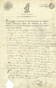 l’État, Membre de la Société Philomatique de Paris, et Professeur d’Anatomie à Toulon (un bord un peu effrangé, petit manque de papier dans la marge inf. sans perte de texte). Certificat d’étude et d’aptitude accordé au Cen Michel Bernard : Larrey certifie que celui-ci, « Chirurgien de 3e classe de l’Armée d’Italie a suivi mes cours publics d’anatomie avec autant de zèle que d’assiduité, il a suivi les cours particuliers que j’ai faits sur différentes parties de l’anatomie et les opérations, il a disséqué avec art toutes les parties qui composent le corps humain, il a manœuvré les opérations sur le cadavre, pansé nos frères d’armes blessés […] avec zèle, dextérité, et une intelligence distinguée. Les examens que je lui ai fait subir dans les cours particuliers et ses succès près des malades assurent en lui des connoissances étendues dans la théorie et la pratique de l’art de guérir ; il montre d’ailleurs les dispositions les plus heureuses pour y faire de grands progrès »…
