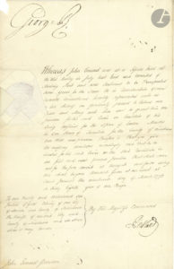 ANGLETERRE. P.S. par GEORGE III, Saint James’s 19 mars 1798 ; 1 page in-fol., sceau aux armes sous papier. Il signe en tête d’une P.S. par le duc de Portland, pour accorder le pardon à John Everard. On joint 2 P.S....