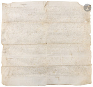 ARDÈCHE. 2 parchemins du XVIe siècle concernant Annonay. Sentence arbitrale pour noble Louis Boulieu contre Méraud son frère, 6 octobre 1539 (grand parchemin, 66 x 63 cm). – 1564 : le seigneur de Charlieu loue une maison à...