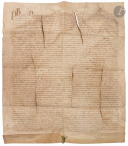 mouillures, mais le texte est parfaitement lisible), restes de cordon vert et rouge. Fondation de l’hôpital Saint-Jacques-aux-Pèlerins de Paris, rue Saint-Denis. [L’ancien hôpital Saint-Jacques aux Pèlerins fut fondé par des bourgeois de Paris ayant effectué le pèlerinage de Saint-Jacques, groupés en confrérie pour héberger les pèlerins. Cette création fut autorisée par lettres patentes du roi Louis le Hutin du 10 juillet 1315. Pour apaiser une querelle avec le curé de Saint-Eustache qui craignait un empiètement de l’église de l’hôpital sur sa paroisse, le pape Jean XXII autorisa par une bulle de 1320 la nomination d’un clergé propre à cette institution et son indépendance des autorités religieuses de Paris. L’hôpital administré par des laïcs bénéficiait de donations princières, parmi lesquelles celles de Charles de Valois et de Jeanne de Bourgogne, et celles de riches notables, ce qui a permis l’extension du domaine par achat de maisons particulières, l’agrandissement des bâtiments et l’ornementation de la chapelle. Certains dons s’accompagnaient de fondations pieuses (messes ou prières à perpétuité) pour le salut du donateur. L’hôpital sera démoli en 1823.] Vidimus fait sous Philippe VI en 1328 (tout début de son règne) d’une lettre du roi Charles IV le Bel du 2 mai 1321 relative à une donation destinée à la fondation de l’hôpital Saint-Jacques-aux-Pèlerins. Donation faite par « Noble homme monseigneur de Nicole de Joynville et madame Phelippe sa fame », de « la terre et seigneurie à Paris qui est appelée la terre de Therouenne » et de leurs revenus, « lesquels maisons et places sont aux confreres de la confrerie de saint Jaques aus pelerins de Paris », sommes destinées à être « appliquées et appriées par iceus confreres a la fondation et edefiement de lospital de saint Jaques de Paris appartenant ausdits confreres nouvelement establi et fondé de par iceus confreres pour eus et pour leurs successeurs en lonneur de dieu et de monseigneur saint Jaques seant à Paris en la grant rue pres de la porte saint Denys […] jusque a la rue de Mauconseil »... Grand document, bien lisible (à l’exception de quelques mots atteints par mouillure), contenant de très nombreux détails. Provenance : catalogue Joursanvault, 1838, n°1052 « Lettres du roi Charles-le-Bel relatives à une donation faite par Nicole de Joinville et sa femme, pour la fondation de l’hôpital Saint-Jacques, situé rue Saint-Denis (1321), vidimus de 1328, très belle charte bien conservée ».