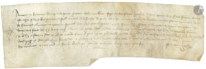 [CHARLES V le Sage (1338-1380) Roi de France]. Pièce manuscrite sur parchemin, 11 novembre 1377 ; 8,5 x 26,5 cm. Don du Roi pour services rendus : Arnaut de Bistairet, bourgeois de Paris, confesse avoir reçu de Francoys de Chantepinne,...
