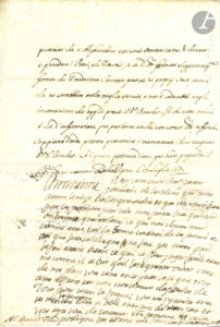 Francesco Villa ; 9 contresignée par le marquis de San Tommaso ; 36 pages in-fol., 18 adresses la plupart avec sceau de cire ou sous papier à ses armes ; en italien, les post-scriptums autographes en français (légers défauts aux bords de quelques lettres). Importante correspondance de la Régente de Savoie au général de la cavalerie de son armée. La plupart des lettres sont écrites de Turin, certaines de Chambéry (octobre 1640), Carmagnola (septembre 1642), Rivoli (octobre 1644, octobre 1656), Front (juin 1646), Valantino (août 1651), la Vigna (juillet 1653), Moncalieri (novembre 1656). Elles sont relatives à la lutte de la Savoie, appuyée par la France, contre les armées espagnoles qui soutiennent les prétentions des beaux-frères de Chrestienne, le prince Thomas de Carignan et le cardinal Maurice de Savoie. Le 20 avril 1639, elle ordonne à Villa de se mettre en sûreté, avec le cardinal de La Vallette, plutôt que de défendre à tout prix les places : « la sureté de vos personnes me sont plus chere que touttes les places que je pourrois conserver »… De Chambéry, le 26 octobre 1640, elle donne les ordres pour sa rentrée triomphale à Turin (reprise au prince Thomas). En septembre 1642, elle se réjouit du succès remporté à Alessandria, et parle de la compagnie de cavalerie accordée par le cardinal Mazarin au marquis Bevilaqui. Après la mort de Vaucocourt, elle fait convoquer un conseil de guerre pour punir des assassinats (1642). Après la perte de Tortona, il faut protéger le pays des incursions ennemies (1645). En 1653, elle rend compte des réclamations du commissaire de l’artillerie Parant, et déplore : « nous nous somme despoulies de tout pour servir la France » (1653) ; elle parle du logement des troupes françaises au Piémont et dans la place de Pignerol… Elle se plaint des désordres dans l’armée française qui va établir ses quartiers d’hiver à Milan (octobre 1654)… Etc.
