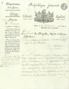 en-tête Le Général de Brigade, Chef de la Division d’Artillerie, vignette, adresse. Au sujet du frère de Grassot, « Lieutenant au 3e régiment d’Artrie à pied, employé à St Domingue […] mort dans cette île au mois de Messidor précédent »…