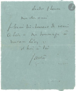Jean JAURÈS (1859-1914). L.A.S., « Lundi 1 heure » [31 octobre 1898], au professeur Lévy-Bruhl ; 1 page in-12, adresse au dos (carte pneumatique). « Mon cher ami, je serai très heureux de venir ce soir – Mes...