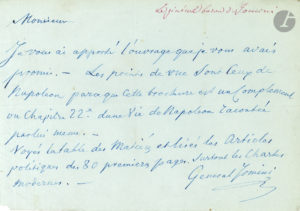 Henri de JOMINI (1779-1869) général et écrivain militaire suisse, au service de Napoléon puis de la Russie. L.A.S. ; 1 page oblong in-8 « Je vous ai apporté l’ouvrage que je vous avais promis. Les points de vue sont...