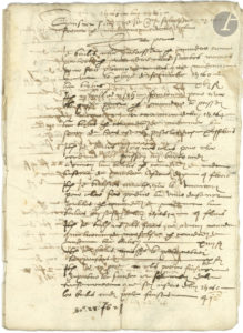LAVAL. Cahier manuscrit, 1580-1587 ; cahier de 12 pages in-fol. Livre de comptes, tenu de 1580 à 1587, par un domestique au service de Madame de Laval : dépenses et achats de produits et denrées diverses pour la maison.