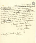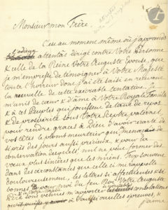 déséquilibré, Heinrich Ludwig Tschech, avait tiré à bout portant sur l’équipage royal]. Il apprend « l’odieux attentat » et s’empresse « de témoigner à Votre Majesté toute l’horreur dont j’ai été saisi en recevant la nouvelle de cette exécrable tentative. Je m’unis de cœur et d’âme à Votre Royale Famille & à ces peuples qui jouissent de tant de repos & de prospérité sous Votre Sceptre paternel, pour rendre graces à Dieu d’avoir écarté de vos têtes le plomb meurtrier »… Il se rappelle que « les lettres si affectueuses & si bonnes pour moi du feu Roi Votre Auguste Père & de Votre Majesté sont venues m’apporter de véritables consolations à d’aussi cruelles épreuves & j’aime toujours lui renouveler l’expression de toute la sensibilité m’a pénétré »…Toute sa famille se joint à lui. On joint : un dessin de son fils Ferdinand duc d’Orléans, 1818 (8 ans) ; une carte de visite du duc de Penthièvre ; deux fac-similés de lettres du comte de Chambord (1849, 1851).