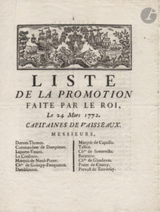 par le Roi le 24 mars 1772 : liste des capitaines de vaisseaux, lieutenant de vaisseaux, enseignes et garde de la marine, qui ont été promus. – Loi relative aux commissaires civils nommés pour la pacification des Colonies, 22 juillet 1792. – Décret de la Convention nationale, 23 novembre 1792, Formation des Bataillons de Gardes Nationales destinés à l’augmentation des forces employées dans les îles du Vent. – Procès-verbal de saisie de marchandises anglaises, nivôse VI (impr. resté vierge). – Décision du Conseil des prises, sur les précautions conservatoires du produit des prises, 3 prairial VIII. Documents divers : quittance signée par un capitaine de vaisseau commandant les gardes de la Marine (Brest, 1695, pour ses appointements), connaissement maritime pour un voyage de Marseille à Port Maurice (1730), procès-verbal de martelage des bois propres à la construction des vaisseaux, 2 reçus des « paquebots-poste français » de la Compagnie Générale Transatlantique (avec timbres, 1877-1878), deux lettres avec bel en-tête de la French-Line. Et un graphe manuscrit avec partie amovible et mentions de bâbord et tribord, servant au calcul de position d’un navire (XIXe).