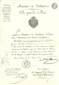 MARINE. 5 P.S., 1814-1836 ; 1 page in-fol. chaque, 4 vignettes aux armes royales. Ordres, lettres de service et feuilles de route de François Autier, de Saint-Malo, élève de l’École spéciale de Marine, puis aspirant,...