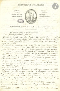 Général de Brigade Commandant, belle vignette gravée, cachet de la collection Maret. Au sujet de la reconquête de l’île d’Elbe. Il a quitté l’île hier par Porto Ferrajo et a visité tous les forts de la côte depuis Piombino, qu’il a trouvés bien surveillés. Il lui a écrit la veille « ce que j’ai fait pour nous assurer l’ille d’Elbe et les événements qui m’ont empêché de nous emparer de Longone. Il m’était impossible d’y marcher sitôt avec de l’artillerie. […] j’ai fait travailler aux chemins, j’espère que l’on pourra bombarder dans deux jours […] avec six mortiers et un obusier […] j’y envoie encore dix canonniers et trois cens hommes en toute diligence, je fais de plus compéter la Compagnie des chasseurs de Piombino par une d’ici ce qui mettra quatre cens hommes de plus dans l’ille d’Elbe. Nous y en aurons environ mille, ce qui est indispensable, la forteresse de Porto Ferrajo demandant bien du monde ». Il pense que Longone ne résistera pas encore longtemps malgré les secours de la mer, et la situation y est terrible : « ils seront tous massacrés. Je leur ai fait dire qu’étant dans le malheur ils auraient toujours un asile au milieu de nous »... Tout est prêt à Porto Ferrajo, « dans les meilleures dispositions », pour la prise définitive de l’île…