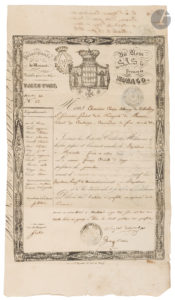 MONACO. Passeport signé par le gouverneur général de la Principauté de Monaco Charles Athanase de Villarey (1780-1871), Menton 23 juin 1838 ; 1 page in-fol. à en-tête Principauté de Monaco, vignette aux armes princières,...
