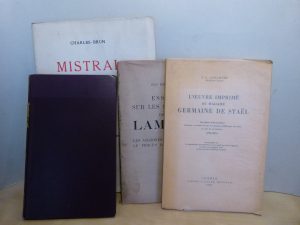 Extrait du Bulletin du Bibliophile. Tiré à 160 exemplaires.— JOINTS : - LONCHAMP (F.-C.). L'&uvre imprimé de Madame Germaine de Staël. Description bibliographique raisonnée et annotée de tous les ouvrages publiés par ses soins ou ceux de ses héritiers (1786-1821 ). Accompagnée de 36 reproductions documentaires en fac-similé des titres originaux et ornée, en frontispice, d'un portrait ancien de Madame de Staël. Genève, Cailler (masqué par une étiquette Lausanne, chez l'auteur), 1949 ; in-8, broché, non coupé. Premier et seul volume de la collection "Documents bibliographiques" des éditions Pierre Cailler. - CHARLES-BRUN. Mistral. Précurseur et Prophète. 1930 ; in-4, broché. Édition originale. L'un des 350 exemplaires numérotés sur papier vélin de Rives à la cuve. Bon exemplaire. - PRÉVOST (Jean). Essai sur les sources de Lamiel. Les Amazones de Stendhal. Le Procès de lacenaire. Lyon, s. n., 1942 ; plaquette in-8, brochée, non rognée. Deux exempalires.