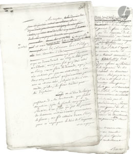 d’un supplément inédit aux Mémoires, préparé pour l’impression, où l’on distingue plusieurs mains, avec de nombreuses corrections et additions en partie autographes, et des passages rayés et supprimés. Il est malheureusement incomplet, et paginé 27 à 138, et 152 à 430 (avec parfois une double pagination ; la fin manque). Les Mémoires de G.-J. Ouvrard sur sa vie et ses diverses opérations financières, avaient paru en 1826-1827 chez Moutardier, en 3 volumes. Ce manuscrit leur est postérieur, comme l’indique la page 27 sur ses relations avec Séguin : « cette partie de mes mémoires a donné lieu à plusieurs observations auxquelles je crois devoir répondre »… Il cite également des documents apparus lors de son procès Outre ses relations avec Séguin, Ouvrard revient sur l’affaire des marchés de Bayonne, et l’hostilité de Villèle secondée par Champeaux, chancelier du consulat de France à Madrid ; ses relations avec le duc de Richelieu ; développement sur l’importance du Crédit public, « cause et effet de la civilisation » ; un autre long développement sur les États d’Amérique du Sud (avec citation d’une lettre de Baring du 10 août 1828), avec un plan « pour régler et achever l’émancipation de l’Amérique du Sud » ; des considérations sur le rôle de la Banque de France… Quelques versos portent des titres de chapitres : « 2(bis) Afres d’Espe », « 3 Rachat de l’impot français », « 4 Emprunts crédit public », « 10 exploitation de l’Amérique indépendante ». On joint un exemplaire des Mémoires (1826-1827, 3 vol. in-8, rel. usagées, défauts).