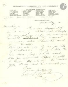 fondateur (avec Hodgson Pratt) de l’International Arbitration and Peace Association. L.A.S. et L.S., Londres janvier-mai 1881 (6 p. ½ in-4 à en-tête de l’International Arbitration and Peace Association). Longue lettre évoquant les activités de l’IAPA et ses divergences de vues avec Lemonnier, le premier meeting qui eut lieu le 13 août 1880 et le nombre d’adhésions qui s’est accru pour arriver à 1500 ; il propose à Lemonnier de devenir l’un des vice-présidents. En mai, il regrette de n’avoir pas reçu les États-Unis d’Europe de Lemonnier. Stanley MATTHEWS (1824-1889) juge américain à la Supreme Court. L.A.S., Washington 16 novembre 1881 (2 p. in-8 à son chiffre) Il accuse réception des brochures de Lemonnier et envoie les coordonnées de quelques personnes pouvant être intéressées par sa cause. « You will observe that what I say in reference to the subject of International arbitration, is incidental and not by way of a full and formal treatment of so fruitful a theme. But the sentiment I have expressed show that I sympathize perfectly with the efforts of yourself and your associates in educating the public opinion of the world in the doctrines of peace and good will »… Hodgson PRATT (1824-1907), pacifiste anglais, fondateur (avec Appleton) de l’International Arbitration and Peace Association (IAPA) en 1880. L.A.S., 9 décembre 1881 (1 p. in-8). « I think your suggestion excellent & I will bring it before our association »...
