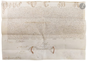 PAPES. PIE VI (1717-1799). Bulle, Rome 5 mars 1776 ; parchemin, 34 x 54 cm, scellé par un fragment de sceau en plomb, pendant sur cordes tressées bicolores ; en latin (transcription jointe). Bulle par laquelle le Pape prend acte de la...