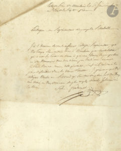 Moselle » ; 1 page in-4, adresse avec cachet de cire rouge (qqs brunissures). Annonce de la capitulation de Mannheim. « J’ai l’honneur de vous informer, Citoyen Représentant, que nos troupes sont entrées hier à Mannheim par capitulation, qui a été la suite de douze à quinze heures de pourparlers et de menaces, mais nous n’avons pas brûlé une amorce. La place nous est remise telle qu’elle est, sauf à la rendre à la paix définitive dans la même situation. Je présume que vos collègues Merlin et Rivaud qui sont tous deux dans la ville vous ont donné ou vous donneront de plus amples détails »...