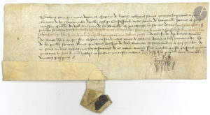 Saint-Germain-l’Auxerrois. « Nous doyen du chapitre de leglise collegiale Sainct Germain Lauxerrois à Paris au nom de la communaulte dicelle eglise confessons avoir receu de honorable homme et saige maistre Guillaume du Val receveur de La Rochelle et Xaintonge » diverses sommes « acause de dix livres tournois de rente chacun an que feu Alphons en son vivant conte de Poitiers donna à lad. communaulte »…