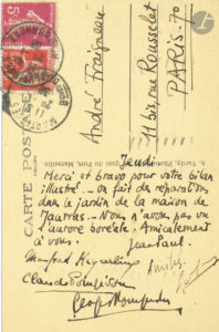 cartes sont écrites par Jean-Paul de DADELSEN (1913-1957), et cosignées par Manfred KEYSERLING, Georges et Claude POMPIDOU, etc. De Martigues, Dadelsen écrit : « Merci et bravo pour votre bilan illustré. On fait des réparations dans le jardin de la maison de Maurras. Nous n’avons pas vu l’aurore boréale »... Et des Baux : « Cher André, y reviendrons-nous à Pâques avec vous ? »…