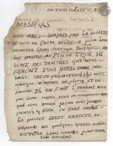 RÉVOLUTION. 5 lettres, la plupart L.A.S., février-juillet 1789 ; 8 pages in-4, 3 adresses. Curieux ensemble sur la Grande Peur dans la Bresse. 8 février, lettre anonyme (en majuscules) adressée à M. de Monburon à Bourg :...