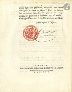 RÉVOLUTION. 11 imprimés, Paris Imprimerie nationale 10 août-6 septembre 1792 ; in-4. Lois portant la griffe de DANTON et le cachet à l’encre rouge de Louis XVI Roi constitutionnel : remplacement du ministère, formation de...
