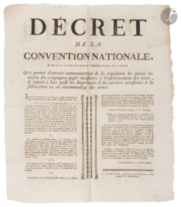 citoyenneté française, l’exportation des cotons, les emplois militaires, les troubles de Lozère, la loi martiale contre les attroupements et le drapeau rouge, la liste des biens des émigrés dans le dép. des Bouches-du-Rhône (dont Mirabeau cadet), la Garde nationale de Marseille, la cocarde tricolore, la surveillance et conservation des objets du château des tuileries et maisons nationales, l’armée des Émigrés… ; les événements de Marseille, l’armée de l’Ouest, le tribunal de cassation, la réduction de Lyon, l’exécution de la Veuve Capet, liste des « rebelles mis hors la loi », les cendres de Voltaire, le brûlage des archives, les Antilles, le calendrier républicain, la Déclaration des Droits de l’Homme, les dons patriotiques, les événements de Vendée et de Lyon, l’annulation de marchés frauduleux, les dépôts de chevaux, la Corse et Paoli, Toulon, l’esprit public, les prisons, l’abolition de l’esclavage, « le mode de gouvernement provisoire et révolutionnaire », un projet d’enlèvement de Louis XVII, Dumouriez, lettres des représentants du peuple en mission (dont Carrier sur les noyades de Nantes) et de généraux, l’accusation contre Danton et Desmoulins, la reconnaissance de l’Être Suprême, etc. ; discours de Cloots, de David (sur la fête de la réunion républicaine) ; l’assassinat des plénipotentiaires de Rastadt, l’établissement d’écoles primaires dans les Bouches-du-Rhône ; Vivent les bons Citoyens de S. Brieuc… ; etc. Plus une affiche de vente d’une maison.