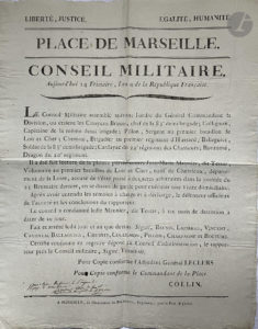 RÉVOLUTION et EMPIRE. 7 lettres et documents. Charles Delacroix (p.s. comme préfet de la Gironde, Bordeaux 19 floréal XII). Général Victor-Emmanuel Leclerc (apostille a.s. au bas d’une affiche du Conseil militaire, Marseille 14...