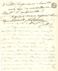 demie in-8, adresse. Elle demande « des nouvelles de la pauvre fille pour laquelle vous avez tant de bonté et qui est à la Pitié ! », et envoie 10 F pour elle. Elle a répondu à une autre personne « que nous ferions notre possible pour seconder ses bonnes dispositions ; mais il fallait qu’elle fût pourvue d’argent en attendant qu’elle put aller à la maternité. Voilà encore une bonne œuvre qui est recommandée à votre ingénieuse charité ». Notice impr. jointe sur Sœur Rosalie.