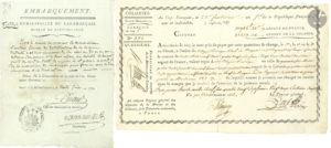 Cap 1783 : considérations financières et sur les affaires de la colonie. Lettre de change (au Cap 1758). – Facture de vente par Mesnier frères et Chaudruc de 35 futailles de café chargées sur le navire La Marie-Louise de La Rochelle (au Cap 1783) ; plus lettre des mêmes (au Cap 1783 et pièce jointe). – 2 lettres pour des tractations d’arrangement de mariage (au Cap 1776). – 2 décomptes d’achat de sucres et autres denrées coloniales, plus quittance (1778). Autorisation d’embarquement délivrée par la Municipalité du Cap-Français (1792). – Lettre de change (en partie imprimée à en-tête Colonies. Saint-Domingue, Cap-Français fructidor V). – Quittance (Jérémie 1793)…