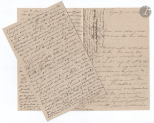 passionnante correspondance sur son voyage de France jusqu’au Tonkin, son installation à Saïgon et sa découverte du Tonkin, au moment de la conquête française. Extrait : « Je suis allé hier à Cho-Len, la ville chinoise qui est à 11 kilomètres. Rien n’est aussi curieux et aussi intéressant que ça, on ne sait pas au juste combien il y a d’habitants, ça va de 125 à 150.000. Il y a pour garder cela une demie compagnie de tirailleurs annamites et quelques gendarmes. J’ai vu une pagode provisoire destinée à rester ouverte un seul jour pour une fête quelconque. J’y ai vu là un amoncellement de curiosités comme le musée chinois à Paris n’en donne pas une idée. Environ une centaine de lustres (malheureusement éclairés par des lampes à pétrole à globe de porcelaine à, ces lustres sont en je ne sais quoi de doré de sculpté, chargé de figures, de statuettes, de pendeloques, c’est éblouissant ; il y a aussi des autels, des brûle parfum en bronze, des arbres taillés en forme de poissons, d’oiseaux, d’hommes, etc., etc., enfin dans cinq jours aura lieu une grande procession qui ira peut-être jusqu’à Saïgon et où plus de 30.000 individus, portant des costumes historiques et des emblèmes, escortent d’immenses dragons. Ce qui rendra mon voyage plus intéressant, c’est la facilité d’aller dans le Cambodge dans les régions montagneuses dans le Siam et le Tonkin, avec les canonnières dont les officiers ne manquent jamais d’inviter leurs connaissances au départ. Plusieurs de nos gens ont déjà fait des excursions des plus intéressantes. Les journaux vous ont-ils parlé des événements récents du Tonkin ? On ne parlait que de ça à mon arrivée. Nos troupes ont fini par se battre avec les troupes tonkinoises enfermées dans la citadelle d’Hanoï. L’engagement n’a pas duré plus d’une heure et nous n’avons pas eu de perte d’hommes. On envoie aujourd’hui cent cinquante hommes de renfort. Ce qui avec 500 environs qu’il y a déjà, va constituer une véritable armée d’occupation très capable de nous conquérir le Tonkin si nos députés ne viennent pas mettre des bâtons dans les roues et faire la besogne des Anglais et des Allemands »… Etc. Lexique comprenant quelques idéogrammes et leur traduction en français ; et quelques notions indochinoises sur les saisons (1 page in-fol.). Carte des environs de Hanoï, formée de 9 parties imprimées non assemblées (20,5 x 18 cm), pour former une carte de 61,5 x 56 cm. Dossier sur l’affaire Poignand-Frotier, affaire d’escroquerie et détournement de fonds publics qui eut lieu à Saïgon dans les années 1880 : 5 lettres et notes (23 p. in-4 et in-fol., 1883-1885) ; plus 2 exemplaires du journal le Saïgonnais où figure un article sur cette affaire (13 avril 1884).