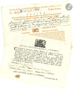 vignettes gravées, délivrés et signés par les autorités de Venise (lettres de voiture, quittances, certificats, lettres de change, laissez-passer, etc.), certains sont restés vierges.