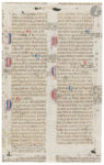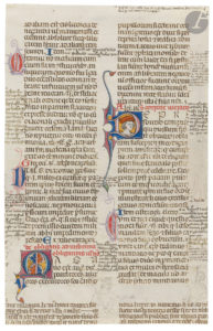 Toulouse ou Montpellier ?, vers 1325-1350. Dimensions : 243 x 156 mm Feuillet extrait d’un manuscrit glosé, texte central sur deux colonnes, éléments de glose disposés autour du texte central, écriture gothique ronde de type « littera bononiensis », rubriques en rouge, nombreuses annotations contemporaines ou proches contemporaines dans les marges, petites initiales peintes de couleur rouge ou bleu, initiales peintes de couleur rouge ou bleu avec décor filigrané violet ou rouge (3 lignes de hauteur), grande initiale M ornée en bleu avec rehauts blancs, sur fond rouge avec décor floral orange et bleu et or liquide, grande initiale D historiée, avec tête de personnage masculin coiffé d’un couvre-chef, initiale tracée à l’encre rose avec rehauts blancs, sur fond bleu, prolongement de l’initiale dans la marge en bleu, rouge foncé et or liquide. Feuillet tronqué, rogné sur les côtés, affectant le texte de la glose. Texte : recto, Liber Sextus Decretalium, Liber I, titulus XVIII, De servis non ordinandis et eorum manumissione [manque le début ; sont présents capitulum 1-5 et début du capitulum 6] ; verso, Liber Sextus Decretalium, Liber I, titulus XVIII, De servis non ordinandis et eorum manumissione [suite et fin, capitulum 6-8] ; titulus XIX, De obligatis ad ratiocinia ordinandis, vel non (notons que la rubrique du présent feuillet indique « obligandis » et non « ordinandis ») ; titulus XX, De corpore vitiatis ordinandis vel non (la rubrique du présent feuillet indique uniquement « De corpore viciato », capitulum 1 et 2. – Texte glosé : Bernardo da Parma, Glossa ordinaria. Ce feuillet est extrait du Liber Sextus Decretalium compilé sous Grégoire IX, dit « Décrétales de Grégoire IX ». Bien qu’il ne s’agisse pas du même manuscrit, le présent manuscrit est à rapprocher de feuillets tel celui de Cambridge, Fitzwilliam Museum, Marlay Cutting Fr. 2, Decretales, liber III, « probably Southern France (Languedoc ?), c. 1330-1340). Voir S. L’Engle, Illuminating the Law, London and Turnhout, 2001, n° 14, pp. 204-206. Les dessins à l’encre tracés dans les marges ne semblent pas renvoyer au texte des Décrétales. On note un roi couronné tenant un sceptre et un homme pendu (suicidé). Un troisième dessin sur la droite est plus pâle et difficile à identifier. Dans un autre manuscrit des Décrétales, connu sous le nom de « Smithfield Decretals » (Londres, BL, Royal 10 E IV : Sud de la France, 14e siècle), on trouve dans la marge inférieure un personnage pendu. Toutefois, nous n’avons pas pu effectuer de lien avec les textes sur ce feuillet, à moins que ce soit lié à la glose (tronquée dans ce feuillet).