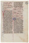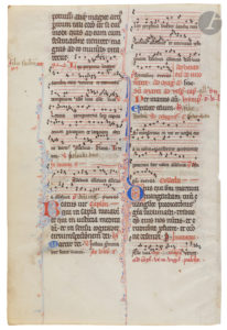 l’encre brune, texte sur deux colonnes, rubriques en rouge, musique notation carrée sur des portées de 4 lignes tracées à l’encre rouge, initiales peintes en rouge ou bleu avec décor filigrané bleu et/ou rouge. Ce feuillet est peut-être extrait du Commun des saints, comme le suggère la rubrique « ad horas de uno martire ». Texte : recto : 2e et 3e lecture ; verso, rubriques, In laudibus antiphona, Alleluia, alleluia ; capitulum, Beatus vir ; Hymnus, Marti dei ; Ad benedictus antiphona, Lux perpetua ; Ad magnificat antiphona, Filie Iherusalem ; Collecta, Deus qui beatum martirum…