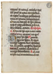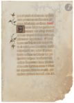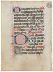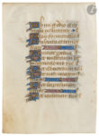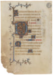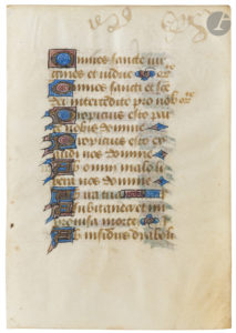 1380-1400 ? En latin. Ecriture gothique à l’encre brune, rubriques en rouge et en français, petites initiales à l’or bruni sur fonds bleu et/ou rose, bouts-de-ligne de même, au verso initiale (2 lignes de hauteur) peinte en rose avec rehauts blancs et décor de vigne de couleur, au recto grande initiale D (5 lignes de hauteur) bleue avec rehauts blancs, décor de feuilles de vignes colorées, sur fonds rose. Dimensions : 150 x 105 mm Manque de parchemin dans le coin inférieur droit. 2. Feuillet extrait d’un livre d’heures, au recto, fin de laudes (?) des Heures du Saint-Esprit et au verso, début de prime des Heures du Saint-Esprit (?), hymnus, « Veni creator spiritus ». France du nord ou Belgique, vers 1450. En latin, écriture gothique à l’encre brun foncé, rubriques en rouge, petites initiales peintes en rouge ou bleu, initiales de deux lignes de hauteur en bleu ou or avec décor filigrané rouge ou bleu foncé, grande initiale « puzzle » en bleu et or avec décor filigrané rouge et bleu. Dimensions : 146 x 104 mm. Bon état général. 3. Feuillet extrait d’un livre d’heures, de petit format, prières après les litanies des saints. France, vers 1450-1475. En latin, écriture bâtarde à l’encre brune, initiales à l’or bruni sur fonds rose et bleu, bouts-de-ligne de même. Dimensions : 92 x 66 mm