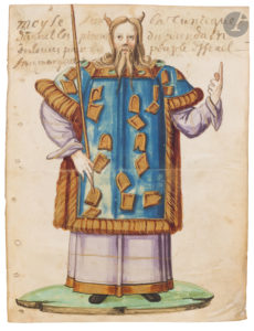 [ENLUMINURE] Moïse représenté de plein pied, avec sur sa tunique les « pierres du Jourdain ». Feuillet extrait d’un ouvrage non identifié. France, vers 1600 ? Dimensions : 200 x 150 mm Inscription au recto (écriture datable du XVIIe siècle)...