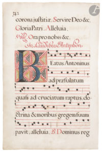 d’un antiphonaire avec antienne pour laudes, messe en l’honneur de saint Antonin (au verso, p. 342). Au recto (p. 341), troisième répons pour messe ou suffrage en l’honneur de saint Antonin.