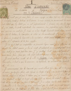 de l’époque). Très important et intéressant manuscrit autographe inédit, contenant les souvenirs d’Indochine de G. Heiderich, soldat d’infanterie de marine à la fin du XIXe siècle. Envoyé servir en Orient en mai 1894, le soldat Heiderich parvint le mois suivant à Saïgon où, tombé malade en septembre il fut admis à l’hôpital. Il resta en soins jusqu’en janvier 1895 et mit à profit cette période d’inaction forcée pour écrire le présent texte, destiné à des proches. Il s’agit d’une œuvre composite : les deux premières parties procèdent d’une observation directe, l’une sous forme de récit. l’autre sous forme de tableau descriptif, tandis que la troisième partie livre une compilation établie à partir de lectures diverses, faites principalement dans Le Royaume de Cambodge par Jean Moura (1883) et dans La Cochinchine religieuse de Louis Louvet (1885). L’œuvre se divise en trois parties distinctes : - « Une traversée de Toulon à Saïgon sur le “Colombo” » (chapitres 1–28), commencée le 21 septembre 1894 : Récit circonstancié de ses 32 jours de voyage, ponctué d’anecdotes sur ses camarades et de descriptions évocatrices (comme celle de l’île Riou dans le détroit de Malacca). Il y évoque aussi sa découverte de saveurs exotiques (bananes, noix de coco) et ses impressions sur les escales (Oran, Port-Saïd, Obock, Singapour). - « Saïgon, ville capitale de la Cochinchine française » (chapitres 29–35), commencée le 6 décembre 1894 : Description méthodique de la ville : le port, l’arsenal, les rues principales, l’hôpital, la prison, le palais du gouverneur général, et même les maisons de tolérance de la rue Borèse. Il y glisse des anecdotes sur la faune locale, les usages monétaires, et mentionne avoir déjà vu des pousse-pousse à l’Exposition universelle de 1889. - « La Cochinchine et le Cambodge. Tonkin. Siam. Annam » (chapitres 36–101). Partie la plus ample commencée le 7 décembre 1894 et terminée le 11 janvier 1895 : Compilation documentaire sur les peuples (Annamites, Khmers, Malais, Chams, etc.), les cultures agricoles (trom, kong, pheu-chuc), la faune (éléphants, tigres, singes), les mœurs (costumes, tatouages, opium, mariages, religions), l’administration coloniale, et l’histoire. Les annexes (chapitres 102–112) incluent des textes de traités coloniaux, des indications sur le filtre Maignen (pour stériliser l’eau, avec 2 dessins originaux), et des questions onomastiques ou historiques. Bien que marqué par un nationalisme vibrant et des préjugés raciaux typiques de son époque, Heiderich condamne la torture (comme les coups de « cadouille », baguette de rotin) et exprime une conscience aiguë des injustices coloniales, évoquant « leur sol violé et leur liberté perdue ». Son expérience personnelle de la perte de l’Alsace-Lorraine a sans doute éveillé sa sensibilité à la condition des peuples colonisés. Il s’agit en résumé d’un témoignage à la fois personnel et documentaire, où se mêlent curiosité ethnographique, récit de voyage et réflexion critique sur la colonisation, teintée d’une ambivalence révélatrice de son époque. Deux timbres de l’époque sont collés sur la première page. En regard de cette première page, figure cette note autographe postérieure au manuscrit : « En souvenir du service que mon (sic) rendu MMme Garnier et fils. G. Heiderich. » Au centre de la seconde doublure devait être encastrée une pièce ou une médaille, aujourd’hui disparue. Frottements d’usage. Quelques rousseurs.
