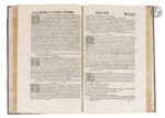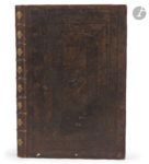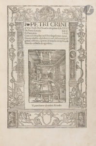 avec décor estampé à froid rapportés, dos à nerfs orné (reliure moderne) Renouard, Bibliographie des impressions et des œuvres de Josse Badius Ascensius, II, pp. 353-354, n° 6. Nouvelle édition des œuvres de Pietro Crinito (1465-1504), figure littéraire italienne célèbre du XVe siècle, disciple de Politan et ami de Pic de la Mirandole et de Paolo Giovio. Il gagnait sa vie comme précepteur auprès des enfants des premières familles florentines, mais mourut avant l’âge de quarante ans. Cette édition réunit ses trois principales œuvres. La première, De Honesta Disciplina, est sa plus célèbre ; il y traite de l’éducation, des lois et des institutions de l’époque classique. La deuxième, De Poetis, fut le premier ouvrage à relater la vie des poètes latins anciens, de Livius Andronicus à Sidoine Apollinaire, il parut pour la première fois en 1505. Le troisième texte, Poematon, contient sa propre poésie néo-latine. Cette édition, superbement imprimée, fut publiée par Josse Bade et reprend celles que ce dernier donna successivement à partir de 1508. On retrouve sa belle marque sur le titre, entourée d’un décor historié gravé sur bois, fait de plusieurs blocs. Le texte comprend de nombreuses et belles lettrines à fond criblé. Exemplaire en reliure moderne avec réemploi des plats d’origine ornés d’un décor de roulettes estampées à froid. Le décor des plats est en grande partie effacé. Très bon état intérieur, avec quelques traits de lecture anciens dans les marges. Petites mouillures marginales sur les bords des derniers feuillets.