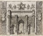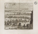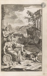 (8 ff), pp. 161-360, (2 ff.), pp. 363-479, (41 ff.), 1 carte, 1 plan, 25 planches. Parchemin blanc rigide, filets à froid en encadrement et fer à motif d’entrelacs à froid au centre sur les plats, dos à nerfs (reliure de l’époque). Édition originale en bas-allemand et néerlandais, dédiée à Nicolaes Witsen (1641-1717), bourgmestre d’Amsterdam. Il s’agit de la traduction de l’ouvrage français de l’homme de lettres et géographe François-Jacques Deseine (....-1715), paru en 1690 sous le titre Description de la Ville de Rome. L’ouvrage est divisé en trois parties et retrace l’histoire de Rome, de sa fondation jusqu’aux règnes des empereurs puis des papes, combinant des approches historiques, archéologiques et littéraires. Il traite, comme l’indique le titre : de « ses quartiers, temples, sénats, églises, palais et autres édifices remarquables, mais également des États anciens et actuels ; séculiers ou ecclésiastiques, en ce compris leurs mœurs et cérémonies. » La partie sur la Rome ancienne est suivie d’un texte de l’historien d’art Giovanni Pietro Bellori (1613-1696) sur les peintures de la tombe des Nasoni, découverte en 1674 dans le secteur de la Via Flamina. Cette édition est très recherchée car l’éditeur a choisi de l’enrichir de nombreuses et très belles illustrations gravées sur cuivre. Ces dernières se composent de deux frontispices, 3 vignettes de titre, 3 lettrines, 3 en-têtes, 22 compositions dans le texte, 2 plans, 6 cartes et 95 planches, le tout gravé par Jan Goeree (1670-1731) et Livinus Cruyel (vers 1640-vers 1720) ainsi que par Pietro Sante Bartoli (1635-1700) pour les gravures du texte de Bellori. Le plan dépliant de la ville ancienne de Rome est remarquable. Bon exemplaire en reliure de l’époque. Quelques salissures et taches aux reliures, bien que celles-ci semblent avoir été nettoyées. Charnière des premiers plats en partie fendue. Les inscriptions à l’encre au dos sont postérieures à la reliure. Déchirure sans manque à la pliure de la planche page 300. Le feuillet figurant avant la page 121 a été mal placé, il devrait figurer avant le feuillet ***1 dans le second volume.