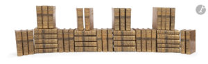 tomes 2 et 3 des planches] ; Genève : Jean-Léonard Pellet ; Neufchâtel : Société typographique, 1778-1779 [tomes 7, 9, 11 à 16, 19 à 21, 23, 24, 26 à 30, 35, 36] ; Neufchâtel : Société typographique, 1779 [Tome 1 des planches] ; Lyon : Amable Leroy, 1780-1781 [Table]. — 45 volumes in-4, basane marbrée, dos à nerfs orné, tranches rouges (reliure de l’époque). Adams, Bibliographie des œuvres de Denis Diderot, I, G6 et G7. Nouvelle édition de la célèbre Encyclopédie de Diderot et d’Alembert. Cet exemplaire propose un mélange des deux éditions genevoises in-4, respectivement désignées comme « Nouvelle édition » et « Troisième édition ». Une telle combinaison, fréquente à l’époque, s’explique par les pratiques éditoriales de Pellet, comme le souligne Adams (G6) :« Pour répondre aux exigences de sa clientèle, Pellet, qui avait lancé sa « nouvelle édition » en novembre 1777, mit en train, dès janvier 1778, une « troisième édition » en collaboration avec la Société typographique de Neuchâtel. Les deux éditions, loin de se concurrencer, semblent avoir vite fait cause commune, car la presque totalité des exemplaires qu’on trouve aujourd’hui, revêtus de reliures uniformes strictement contemporaines, sont composés de volumes provenant de l’une et de l’autre édition. Mises à part les pages de titre, les deux séries ne présentent pas de différences sensibles. En fait, elles furent imprimées, du moins en partie, sur les mêmes presses, ce qui explique leurs étroits liens de parenté. » Cet exemplaire, en reliure uniforme, se compose de 18 volumes issus de l’édition Pellet et de 21 volumes de l’édition Genève et Neuchâtel. Fait rare, il est ici enrichi des 6 volumes de la Table analytique et raisonnée des matières contenues dans les XXXIX volumes in-quarto du dictionnaire des sciences, des arts et des métiers, publiés à Lyon par Amable Leroy en 1780 et 1781. Ces 6 volumes sont reliés à l’identique de ceux de l’Encyclopédie. Les volumes de texte incluent un portrait de Diderot et de d’Alembert, gravés par Cathelin d’après Cochin, ainsi que 9 des 10 tableaux dépliants hors texte prévus, répartis comme suit : Tome 1 : Système figuré des connaissances humaines, Table de la mer Adriatique, Dimensions des affûts de campagne, Division générale de l’Afrique Tome 2 : Division générale de l’Amérique Tome 7 : État des biens affermés distingués par nature et quotité Tome 13 : Division générale de l’Europe Tome 19 : Tableau des mesures itinéraires anciennes Tome 26 : Table du rapport des poids des principales places d’Europe. Il manque le tableau du tome 3. Les trois volumes de planches rassemblent 435 planches, dont 10 cartes dépliantes. La planche sur l’Horlogerie, généralement placée dans le volume 36, figure ici à la fin du troisième volume. Un feuillet manuscrit contemporain, listant les auteurs des articles, a été ajouté en tête des tomes 2 à 10, 16, 17, 20, 24, 28 et 31. Le tome 13 est un exemplaire de l’édition Pellet auquel ont été retirés le faux titre et le titre original, ce dernier remplacé par le titre aux adresses de Genève et Neufchâtel. Bel ensemble même si la plupart des reliures présentent des frottements et des épidermures, certaines importantes, quelques travaux de vers et des manques notamment à plusieurs coiffes. Dernier feuillet du second tome doublé. Déchirure sans manque au titre du troisième volume et au feuillet Zzzz4. Quelques galeries de vers et de très rares mouillures.