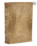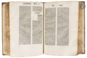 de bois, plats ornés d’un décor d’encadrements de filets et de roulettes de feuillages à froid, compositions de croisillons à froid au centre, dos à nerfs (reliure de l’époque). Polain, I, 395. - Pellechet, 1460. - BMC, I, 149b. - Proctor, 681. - Hain *1948. Première édition strasbourgeoise des Opuscula plurima de Saint Augustin, imprimée par Martin Flach qui en donnera une nouvelle édition en 1491. Il s’agit de la réunion de différents traités de Saint Augustin. Il en parut plusieurs éditions sous ce titre mais qui diffèrent presque toutes. Celle-ci comprend les textes suivants : Meditationes, Soliloquia, Manuale de verbo Dei, Enchyridion, De triplici habitaculo, Scala paradisi, De duodecim abusionum gradibus, De beata vita, De assumptione virginis marie, De divination demonum (Traité qui aborde la question des pratiques divinatoires païennes et de leur origine démoniaque), De honestate mulierum, De cura agenda pro mortuis, De vera et falsa penitentia, De cordis contritione, De contemptu mundi, De convenientia decem preceptorum, De congnitione vere vite, les 13 livres des Confessions, les 4 livres de la Doctrine chrétienne, De fide ad petrum, De vita et moribus clericorum, De vera reliogione, De spiritu et anima, De vita christiana, De diffinitonibus orthodoxe fidei, De disciplina christiana, Sermo de charitate, De decem chordis, De ebrietate, De vanitate seculi, De obedientia et humilitate, De agone christiano, De bono discipline, Regula de communi vita clericorum et Possidonius de vita santi Augustini. L’édition est imprimée en caractères gothiques sur deux colonnes de 50 lignes. Elle fut imprimée par Martin Flach (144.-1500), bourgeois de Strasbourg dont l’activité en tant qu’imprimeur est attestée dans cette ville en 1487. Il mourut le 26 octobre 1500. Exemplaire en reliure de l’époque, enrichi de quelques notes marginales anciennes dans les marges. Reliure restaurée, les coiffes ont été refaites, les gardes renouvelées. Les indications au dos sont postérieures, il manque les fermoirs. Salissures et trous de vers sur les plats. Trous et quelques galeries de vers sans gravité aux feuillets. Quelques mouillures, surtout à la fin. Déchirure angulaire au feuillet CCLIX, sans atteinte au texte. Provenance : bibliothèque de franciscains de la stricte observance, avec ex-libris manuscrit sur le titre « Pro bibliotheca Rev[erendum] f[ra]t[rum] minor[um] de observantia ».