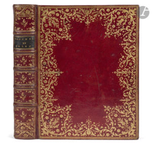 dorée aux petits fers, dos à nerfs orné, roulette dorée intérieure, tranches dorées, emboîtage à dos de maroquin noir (reliure de l’époque, emboîtage moderne). Cohen, 653. Belle édition, dite des curieux, proposant en parallèle les traductions de Jacques Amyot (1513-1593) et d’Antoine Le Camus (1722-1772), celle de ce dernier paraissant ici pour la première fois. L’illustration se compose du frontispice et des 28 figures de l’édition de 1718, dite du Régent, ainsi que de la figure des “petits pieds” (p. 162), le tout retouché et entouré de très beaux cadres par Simon Fokke (1712-1784). Elle comprend également une petite vignette de titre, 8 en-têtes d’Eisen, dont 2 en double et 1 en triple, et 8 culs-de-lampe par Cochin, dont 3 répétés, le tout gravé par Fokke. Il s’agit des mêmes figures que dans l’édition grecque et latine de 1754. Les culs-de-lampe proviennent de l’édition de 1745, agrandis et retournés. Précieux exemplaire sur grand papier, dans une splendide reliure à dentelle de l’époque, dans le style de Derome ou de Louis Douceur. Légère fente restaurée à une charnière. Provenance : Henry David Leonard George Walston, baron Walston (1912-1991), agriculteur et homme politique britannique, avec son -ex-libris héraldique comprenant les mentions « Wachsthum und Stetigkeit » et « Newton Hall, Cambridge ». - Vente Christie’s du 29 novembre 1999, avec signet.