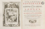 LONGUS. Les Amours pastorales de Daphnis et Chloé. Paris : imprimée pour les curieux, 1757. — Petit in-4, 198 x 155 : frontispice, viii, 269 pp., 29 planches. Maroquin rouge, roulette dorée en bordure des plats, entourant une large dentelle...