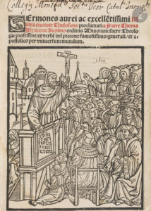 : (8 ff.), CXXI ff., (1 f.), ff. CXII-CCXXVII, (2 ff. dernier blanc). [sig. +8, A-Q8, a-l8, m6, n4). Basane marbré, dos lisse orné, tranches mouchetées (reliure du XVIIIe siècle). Édition originale très rare de ce recueil de Sermons du religieux franciscain Illyricus Thomas (1485-1528), transcrits par Masseo Bruna di Frossasco. Originaire de Dalmatie, Thomas Illyricus entra dans l’Ordre chez les Observants, à Osimo, et commença très jeune (25 ans), en 1510, la vie de prédicateur populaire en Espagne, Italie, France... Cette édition, divisée en 2 parties, propose les sermons qu’il prêcha à Toulouse lors de son passage dans cette ville en 1518 et 1519. La première partie en comprend 25 sur Jésus Christ et la seconde en contient autant sur la Vierge Marie. La particularité est que l’auteur a écrit non seulement le texte mais également la mise en scène de ses sermons, se situant ainsi dans la tradition des grands prédicateurs du Moyen Âge. Il explique, par exemple, dans le second sermon consacré au Saint nom de Jésus : « Aussitôt que je suis dans la chaire, je fais le signe de la Croix, je joins les mains et j’élève mes mains jointes presque à hauteur de mon visage ; je reste ainsi en silence pendant la durée d’un Credo. Ensuite, je chante une antienne, j’invoque le nom de Marie en récitant l’Ave Maria et en me mettant à genoux. Après avoir récité l’Ave Maria, je récite, en silence, le Veni Sancte Spiritus. Ensuite, je me relève, et, après un instant de silence, j’annonce le thème de mon sermon, puis je crie : Al mome sia del bon Jesu et de la sua madre Maria et del tutti li santi del paradisio la pace de Jesu Cristo sia con noÏ. Amen. Je propose l’exorde et je continue le sermon » (passage tiré de Marie-France Godfroy, dans l’article intitulé Le prédicateur franciscain Thomas Illyricus à Toulouse (novembre 1518 - mai 1519), publié dans les Annales du Midi en 1985). Belle impression toulousaine en lettres gothiques, sortant des presses de Jean de Guerlins. Le titre est imprimé en rouge et noir et comporte une belle et grande gravure sur bois à trois quarts page, représentant Thomas Illyricus prêchant sur la place Saint-Georges à Toulouse. On trouve également au feuillet Q8 recto, avant la partie consacrée à la vierge Marie, une figure gravée sur bois à pleine page, représentant la crucifixion. Exemplaire en reliure du XVIIIe siècle. Épidermures, quelques travaux de vers et manques à la reliure. Coiffes arasées, coins émoussés, manque une partie de la pièce de titre. Mouillure claire sur le bas des feuillets. Déchirure sans manque au feuillet LXIX. Provenance : ex-libris manuscrit sur le titre. - Société scientifique d’Arcachon ?, avec cachet plusieurs fois répété.